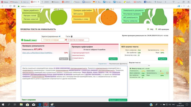 Заказали в рефератной конторе диплом на тему "Россия в предвыборной кампании в США 2016 года". Оригинальность 85%. И я там много переводил через гугл, потом редактировал. А оказалось, что проверка идет по text.ru, который схожие тексты "заворачивает". Не прямые совпадения, а именно аналогичные. Фишка оказалась в том, что эти же статьи кто-то перевел до меня и выложил на каких-то сайтах. Заказчик сначала поскандалил. Я выразил свой аргумент: "вы не указали, в какой программе проверяют". Затем от него ответ: "часть группы отсеяли, а у меня прямых совпадений нет, разрешили переделать".