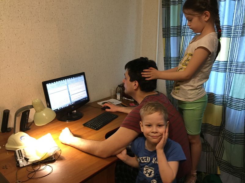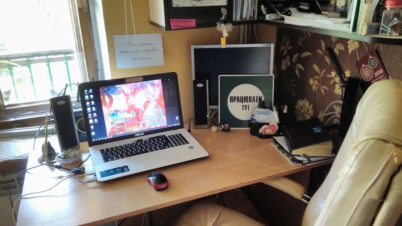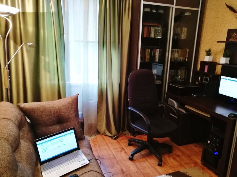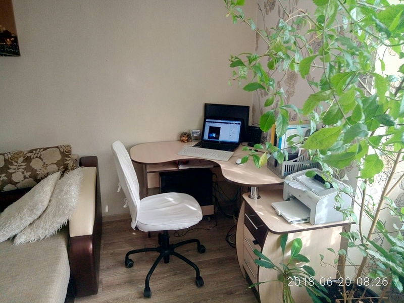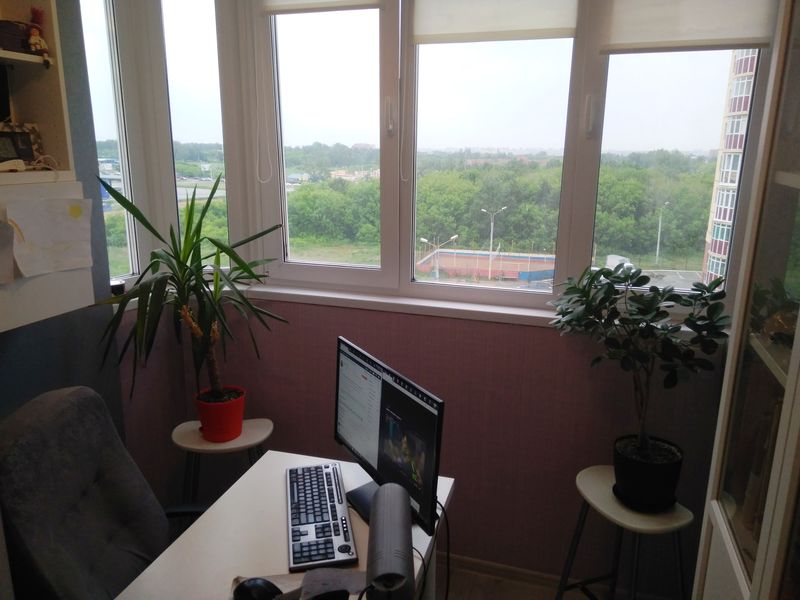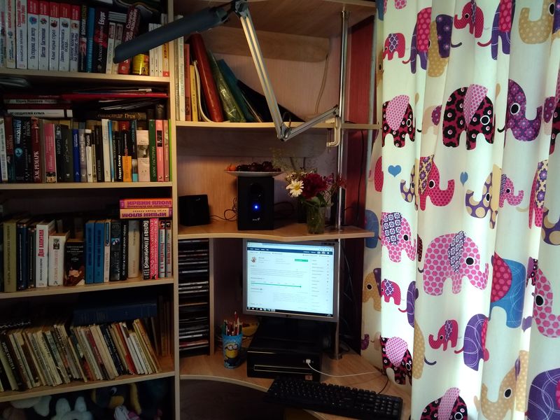 Я свое даже сфотографировать не могу. Прислать разве что фото ноутбука. Потому что работаешь и за столом, и на кровати, и на ступеньках во дворе, и на полу, и на качелях, когда тепло, иногда на подоконнике, в машине, в парке, когда повезет на хорошую погоду, что в этом году в Екатеринбурге редкость..)