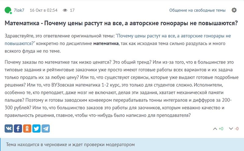 Да я не имела в виду конкретного заказа. Просто есть на Студворке несколько авторов, после которых отписываться бессмысленно: рейтинг у них больше моего в разы, отрицательных отзывов -ни одного, а цены ставят - там не то,что ниже оценить,даже такую же цифру назвать - и то будет покупка себе дополнительного гемора. Кстати,иногда мне заказчики в ЛС предлагают что-то, я захожу по ссылке, вижу - там уже кто-то из этих авторов отписался, цену поставил - за нее и открывать приложенные файлы: уже сверхурочные... Отвечаю: у вас там такой-то отписался, я за эту же цену могу написать "введение". Слово ВВЕДЕНИЕ. Содержание введения уже требует дополнительной оплаты...