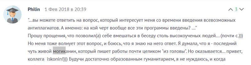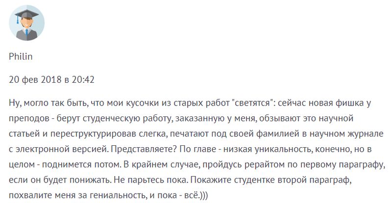 Пусть Вас не смущает, что в предпоследнем сообщении Philin говорит, что не обладает гениальностью, а в последнем просит заказчика похвалить её за гениальность. Уверен, что тут тоже не так всё просто, но речь о другом. Поставьте себя на место автора - Ваши работы нагло воруют. Вы отдаёте студенту работу, которую написали ещё 30 лет назад, а потом выясняется, что её подлец-преподаватель своровал и год назад опубликовал в электронном журнале. Таким образом, когда Philin говорит, что использует копипаст, это не копипаст на самом деле. Это её же статьи, которые у неё украли. Так что в том, что Philin пишет работы одновременно из головы и не из головы, противоречия нет на самом деле.