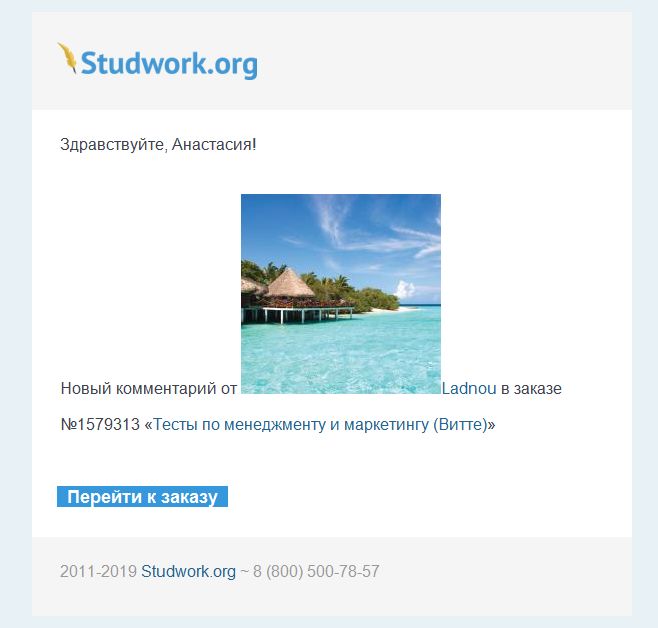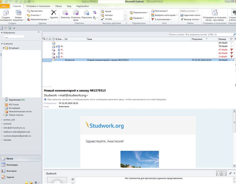 ну вот, смотрите, аутлук развернут на весь экран, видна зона чтения письма. В ней нет никакой полезной информации: большое лого студворка, мое имя, кусок аватара автора. Ну ок, в названии письма виден номер заказа, но не ясно, что это за заказ, по номерам, извините, не помню.