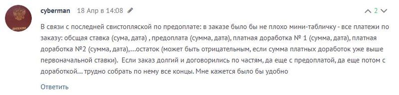 "Общую стоимость работы вы прописываете в комментарии к заказу" - это не кажется вам бредом? Почему вместо того чтобы нормально пописать ставку в ставку я должен писать ее в комментарии? В ЛС еще скажите. Месяца два назад ( а работы над большими заказами и по 3 месяца бывает идут и и больше). При этом система ничем мне не поможет - она ведь не знает чего я там в комментарии прописал...