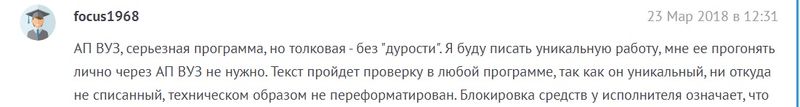 Я: Естественно, я это понимаю, однако, во-первых, в технических работах пишем по рекомендованной методичке, и ВУЗам плевать на "технический плагиат", вынь да полож %. Во-вторых, сам АП работает некорректно. Мне нужно видеть "чистые" и "нечистые" фрагменты. Когда у меня будет больше 70%, согласен проверить и в системе заказчика, если он предоставит, но не ранее.