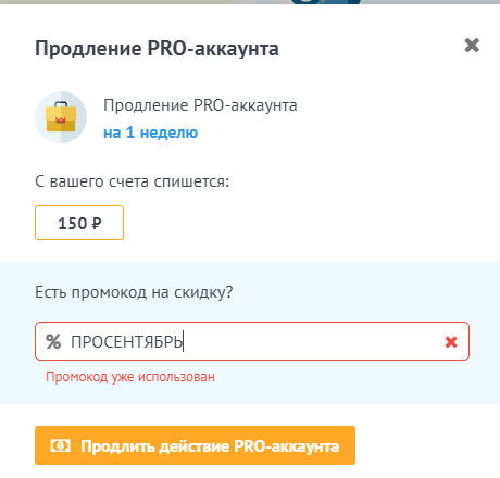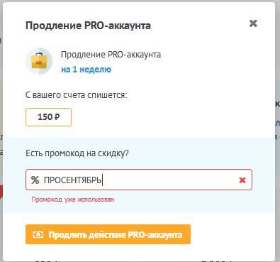 Промокод «ПРОСЕНТЯБРЬ» на 100% скидку для покупки PRO-статуса на неделю.