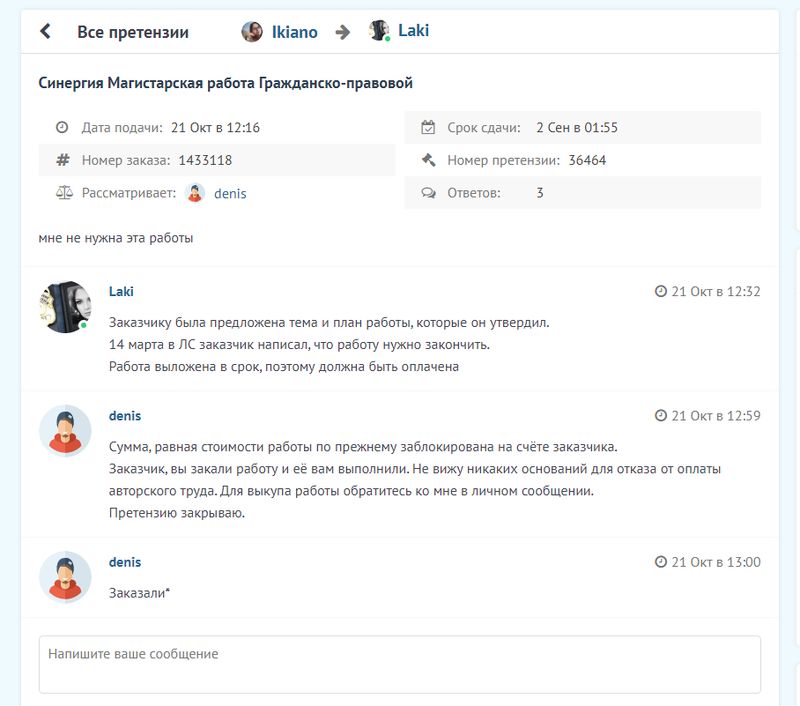 Markus 1 Ноя в 09:55: я не могу понять, что вы хотите от меня? Я же вчера вроде как признал свою ошибку. Причём тут наплевательское отношение? У меня куча забот, и сидеть разбираться с претензией вашей у меня нет времени. Если сказал, что выкуплю, значит выкуплю. А если у вас такая потребность в деньгах, то обратитесь в банк за кредитом, а не торопите заказчиков с выкупом. Всякое случается, авторы не выкладывают работы в срок, заказчики не выкупают. Психология человека устроена так, что как не поступи, всё равно останешься виноватым.