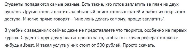 В учебных заведениях сейчас даже не представляете что творится, особенно на первых курсах. Студенты друг другу платят просто за то, чтобы тот скачал реферат с какого-нибудь allbest. И такая услуга у них стоит от 500 рублей. Просто скачать.
