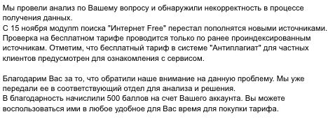 Антиплагиат сломался... Выдает 100 % ную оригинальность файла (должно быть 85-90 %, т.к. буквально перед этим проверял черновики)