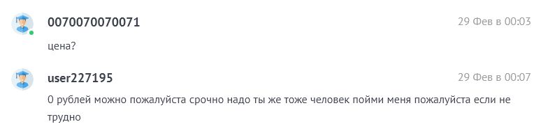 может быть два варианта: либо один человек с трех аккаунтов, либо 3 дебила, которые пытаются рассказать, что они друг друга не знают, выставляя одинаковые комменты к заказам и цены. Мне не понятно, для кого они заказывают, что 200 -400 рублей для них дорого. Ладно бы было дорого за перевод чисел в СС, где можно калькуляторами пользоваться. Но писать, что за серьезную работу 400 рублей - дорого. Помню ВКР на 50 страниц по узкой медицинской тематике за 300 рублей. И на серьезных щах спрашивали, готов ли я делать)