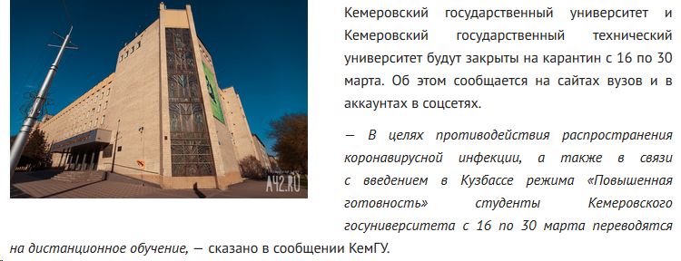 Вузы пока работают. Но и там преподаватели будут больше давать работы на самостоятельное изучение, а это рефераты и прочее. Так что главное - это просто не болеть))) Всем здоровья !