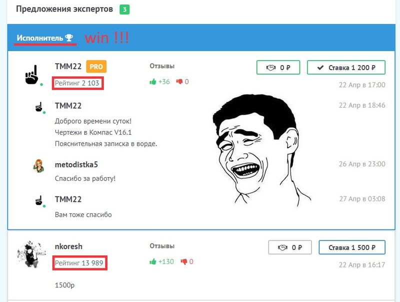 Вы реально готовы работать бесплатно? Вчера только с одним из пользователей обсуждала заказ по философии (ответы на огромное количество вопросов, причем ответы не абы какие, а по конкретным произведениям и не "да" и "нет"). Заказ ушел за 700 руб., т.е. автор получит 560 рублей чистыми. Пользователь тот списался с автором и поинтересовался, сколько примерно времени отнимет эта работа. Ответ: 12-14 часов (я бы примерно так же по затратам времени оценила). Вдумайтесь: 12 часов сидеть за 560 рублей! Т.е., по ставке меньше 50 рублей в час, причем не просто сидеть и плевать в потолок, а весьма интенисвно думать, анализировать и т.д. Это насколько же нужно себя не уважать?!? Демпинг вполне понятен, все с этого начинали. Но одно дело - демпинговать на эссе, которое можно написать за 30-45 минут, и другое - дарить кому-то 12 часов напряженного умственного труда.