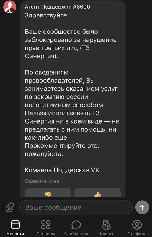 Всем добрый день, на днях в группу мне писал человек с помощью оказать услуги для университета СИНЕРГИЯ, тесты и курсовая, поведя с ним диалог и убедившись что он собирается заказать, жду оплату как обычно, проходят сутки-двое, группу блокируют, на что пишу в поддержку отвечают такое сообщение-Группу заблокировали по запросу официальных представителей ТЗ «Синергия».По сведениям правообладателей, Вы занимаетесь оказанием услуг по закрытию сессии нелегитимным способом.Прокомментируйте это, пожалуйста. -Причем этот же товарищ начал писать и в другую мою группу с теми же вопросами об оказанию помощи.