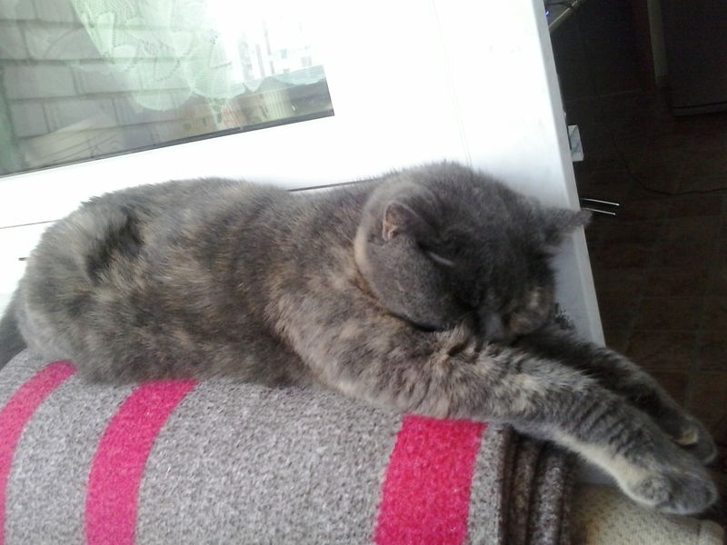 Наш средненький кот Жорик так же любит лежать - именно лапки передние вытягивает вперед))) думали, на солнышке греется, а сейчас и дома так лежит, а другие наши коты так не делают...