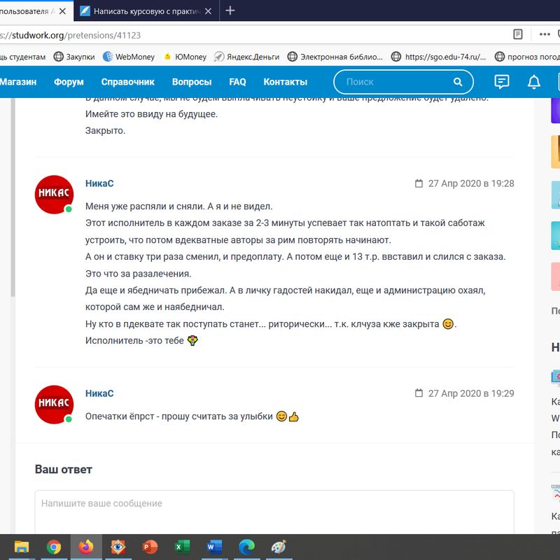 На трех сайтах помимо этого мгновенная кнопка "снять ставку". А эти 24 часа ничем нельзя оправдать. То есть когда им оцениваешь 20-30-50 заказов и они не отвечают, если там даже задания нет, все напутано, или просто не говорят, я вас возможно выберу, а через 2-3 дня внезапно вносят предоплату, когда уже нет ни времени, ни желания, это в порядке вещей, кому это выгодно, непонятно. Я вынуждена после того, как кто-то согласится, ходить по ссылкам и 10-15 писать, чтобы не выбирали. То есть им нормально оптом выклаывать, одно задание 3-5 посредников выкладывют, а тут такие нежные, то приходят и командуют "убирайте предоплату и работаем", естественно их выходки шокируют. Один вообще не мог выяснить сутки вариант, и НЕ отвечал мне, чтобы заказ снял, просто читал молча, когда там уже просрочено было, потом на следующий день дает мне 5 часов, чтобы его сделать, естесственно был послан. Нормальных единицы.