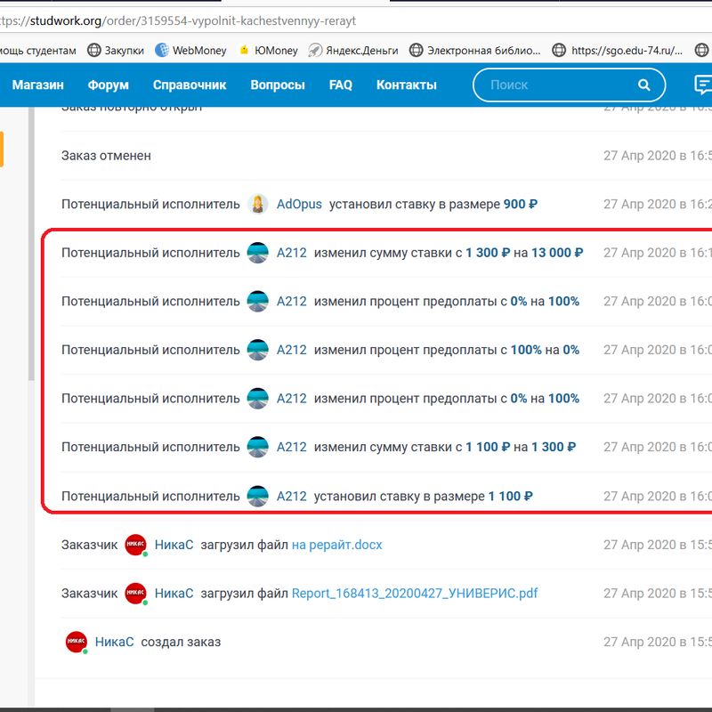 Посредники распределяют заказы на все сайты, ждут где подешевле, спят уже после 21.00. С утра начинают проверять, выкладывать свои неактуальные заказы, причем все разом. Думают минимум сутки, потому что ждут подешевле. У студентов прошаренных тоже такое случается, но в разы меньше. Их тоже можно отнести к посредникам. Я тут только готовое оцениваю, что у меня уже есть, либо только студентам (юзерам). Куча посредников это как фон, пустая трата времени, работы им не нужны. Вот вчера написано автор вообще не разбирается в сопромате, и 5 отрицательных отзывово, посредник, сравнив мои 3000 и его 1300, выбирает его. Пожелаю ему геморроя. О студенте он не заботится.
