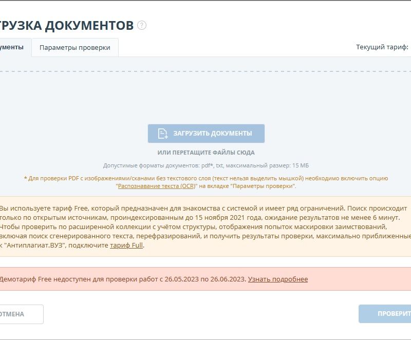 С 26 мая по 26 июня 2023 года возможность проверки документов на демотарифе Free в сервисе «Антиплагиат» будет временно приостановлена.