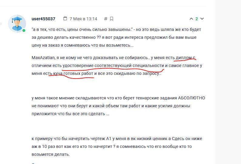 "к примеру что бы начертить чертеж А1 у меня в вк низкий ценник а Сдесь он ниже аж в 10 раз вот как его кто то начертит ? я сомневаюсь что его вообще кто то возьмется делать" - но ведь как-то авторы-технари здесь работают? И отлично зарабатывают. У них масса положительных отзывов. То есть, я более чем уверена, что они делают качественные работы.