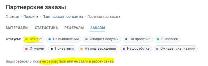Почему сейчас в партнерской программе отображаются только заказы которые выполнены? не отображаются как раньше размещенные партнерами? крайне неудобно. Если нажимаю открыты - пишет заказов нет, но заказы открытые , размещенные рефералами при этом есть.