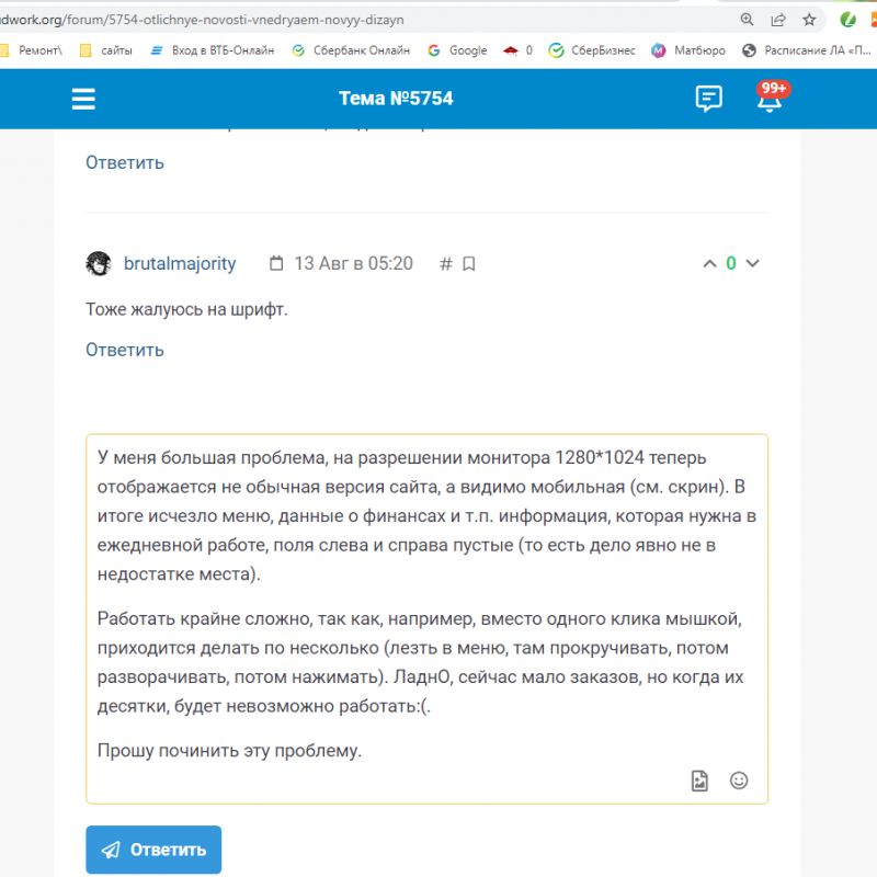 У меня большая проблема, на разрешении монитора 1280*1024 теперь отображается не обычная версия сайта, а видимо мобильная (см. скрин). В итоге исчезло меню, данные о финансах и т.п. информация, которая нужна в ежедневной работе, поля слева и справа пустые и широкие (то есть дело явно не в недостатке места).