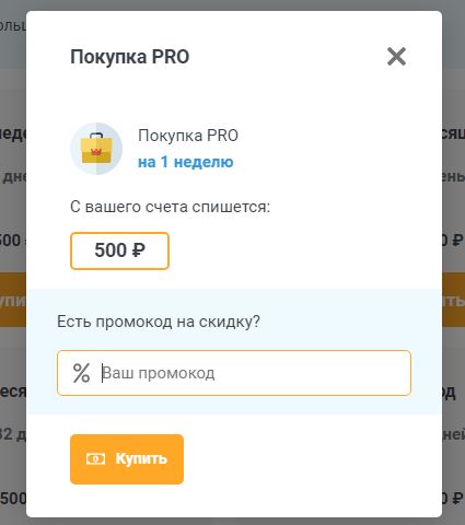 Нажимаете "Купите PRO-аккаунт для получения всех преимуществ сервиса", выбираете срок "1 неделя" (это самая первая опция), и после нажатия купить/продлить появится поле для введения промо-кода.