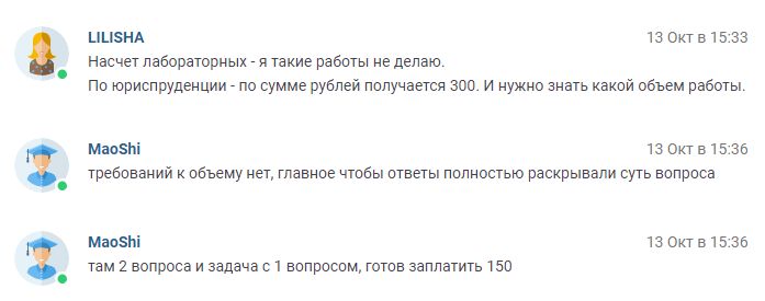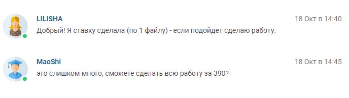 Посредники - отдельная тема. Большинство из них, увы, просто мост между заказчиком и исполнителем, слепо пересылающий сообщения и вопросы туда-обратно, реально мешают, только деньги гребут. Вплоть до маразма, скидываю два файла готовой работы: скрипт отдельно и построчное описание в ворде отдельно. Посредник: "Я просила построчные комментарии". Я: "Вы хотя бы открывали второй файл?". Она: "А, ок, пришлите любой файл, сниму с доработки". Вообще свою роль не отрабатывают, не фильтруют, постоянно отвлекают зря. Принципиально ставлю ставки, не делая скидки на посреднические надбавки. Цена для студента выходит адская, но я тогда лучше просто пропущу заказ.