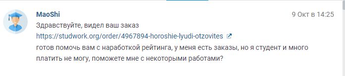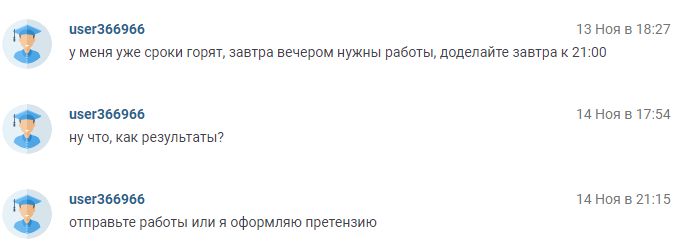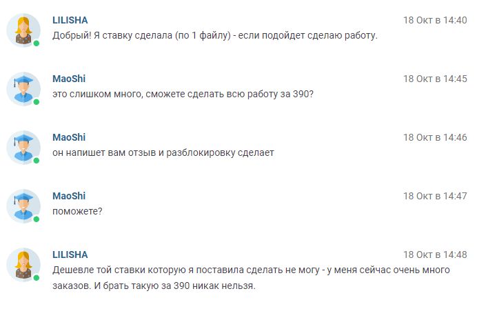 Был заказ (нужно было сделать 6 докладов и 6 презентаций) я оценила в 1500 рублей. Ему было дорого. В итоге написал написал отзывы за те заказы которые уже были сделаны - я ему пошла на уступки сделала заказ за 200 рублей. В итоге отрицательные отзывы и возвращение денежных средств.
