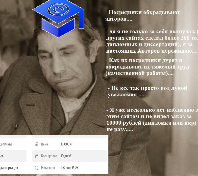 да я не только за себя волнуюсь (я на других сайтах сделал более 300 только дипломных и диссертаций), я за настоящих Авторов переживаю. Как их посредники дурят и обкрадывают их тяжелый труд (качественной работы). Что касается большого объема работы сразу - если вы пишите самостоятельно а не используя труд других, то должны знать что качественно можно писать сразу только 2 дипломные работы, дальше чем больше работ сразу пишешь , тем качество резко падает. Так что я лучше знаю эти вопросы....