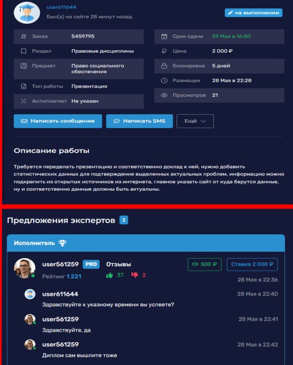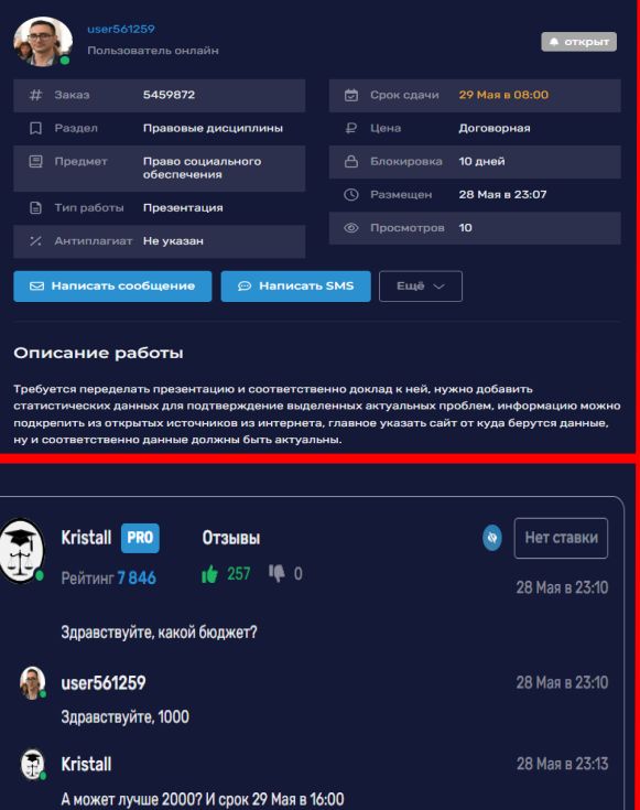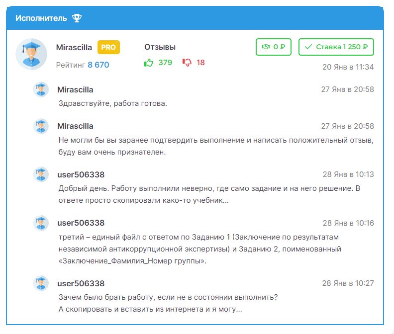 Так вот прикол в том, что заказчик оставил тому исполнителю замечательный отзыв на момент сотрудничества, отзыв потом не поменял, да и даже части денег из 20+ тыс заплаченных решил не требовать с того нерадивого... И висит там теперь отзыв о том, какой тот исполнитель молодец и какие он отличные юр дипломы пишет.