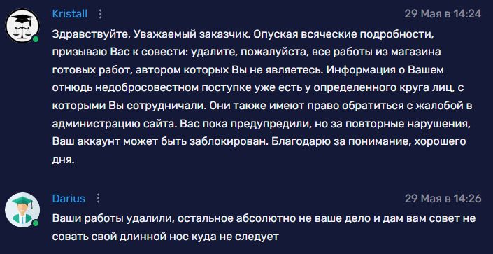 Две моих работы продавались, спасибо Kristall, написала админам, работы удалили, я в чс у заказчика)))) Схема "гениальная". Самое плохое, что покупок работ было не так мало. Писнесмен мамкин