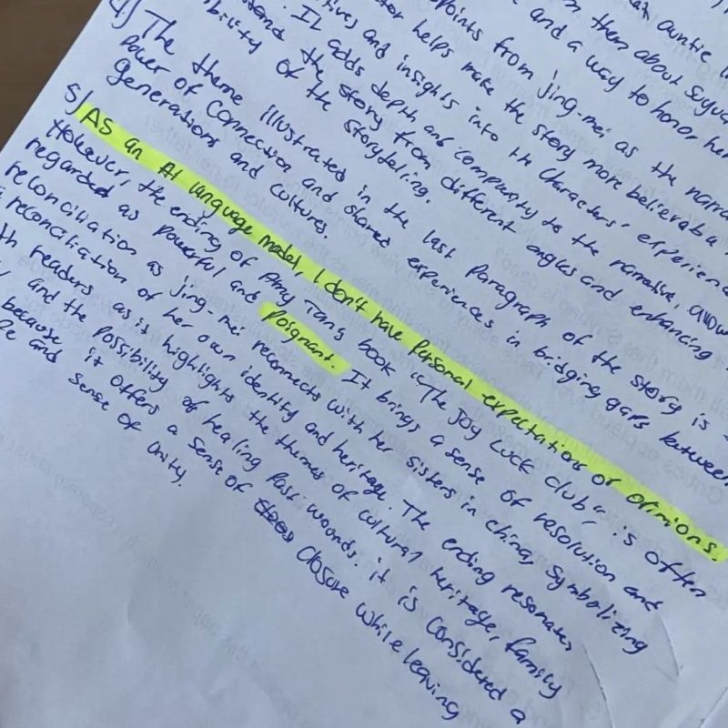 Да все читать и не надо))) Тут суть в том, что чел написал эссе от руки, при этом переписав явно сгенерированный текст еще и приписку от ИИ написал "Как языковая модель, я не обладаю персональным мнением...."