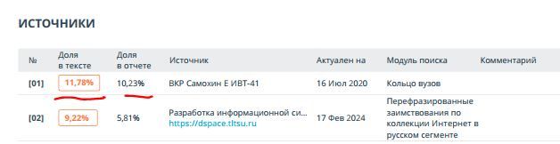 Доля в отчете — отношение объема заимствований, которое учитывается из данного источника, к общему объему документа. Если один и тот же текст был найден в нескольких источниках, то учитывается он только в одном из них. При изменении конфигурации отчета (включении или отключении источников) данный показатель источника может меняться. В сумме дает процент заимствований и цитирований (в зависимости от цвета источника).