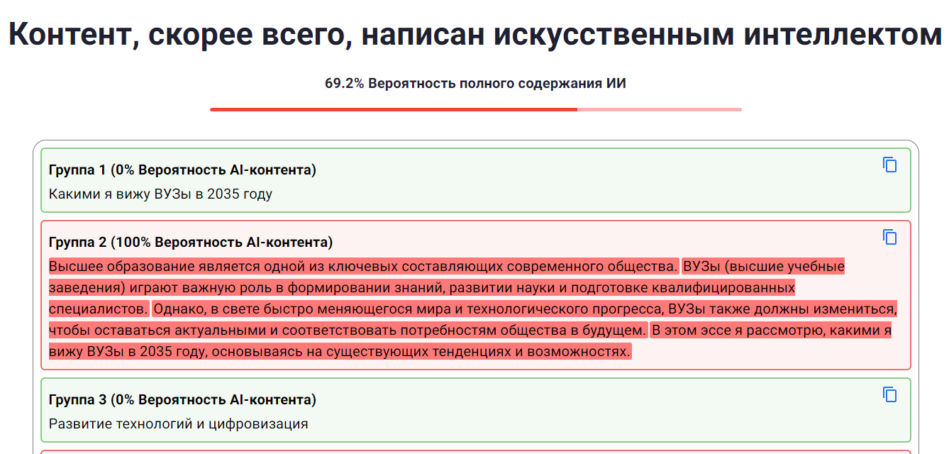 Очевидно - жить стало лучше, жить стало веселей. Абсолютно все текстовые работы без проверки на антигенераторах могут быть что..? Правильно, сгенерированы. Сюда попадают как фабрики однотипных заданий (ТУСУР, РосДистант, частично Витте, ММУ, ..), так и большинство курсовых и других вариантов "научной" деятельности.