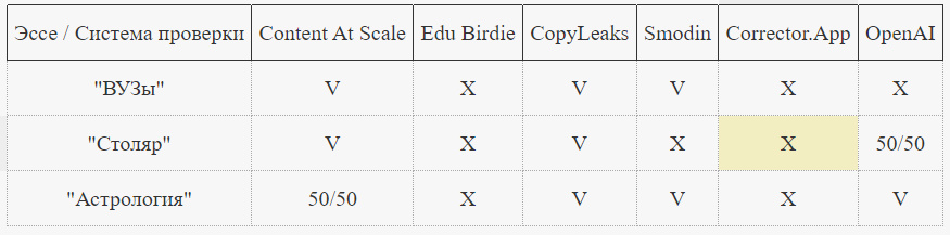 Т.к. некоторые системы проверки выдают ответ вида "вероятно, текст сгенерирован" (без четких утверждений), то допускаем, что все варианты "(очень \ средне \ ..) вероятно, что текст сгенерирован" - приравниваем к "текст сгенерирован ИИ". Соответственно, (мало \ не очень \ ..) - приравниваем к "текст написан человеком".