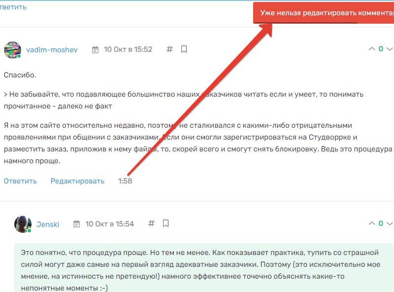 Я не смог отредактировать сообщение, у которого ещё не истёк таймер (см. скриншот). Возможно, это связано с тем, что на мой пост уже ответили, поэтому возможность вносить изменения пропала. Но тогда надо убрать и таймер вместе с кнопкой редактирования.