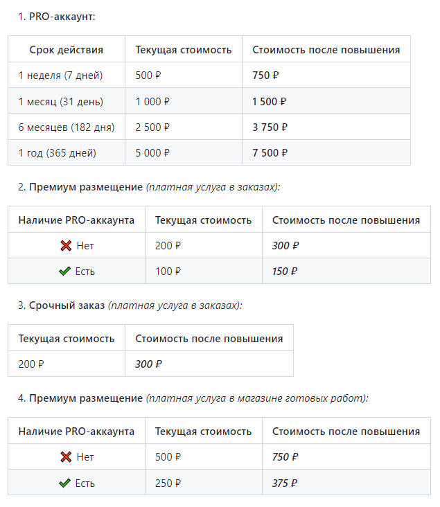 Уважаемые пользователи! Обращаем ваше внимание, что с 01.03.2024 на сервисе планируется повышение стоимости на ряд платных услуг в связи с увеличением затрат на обслуживание сервиса.