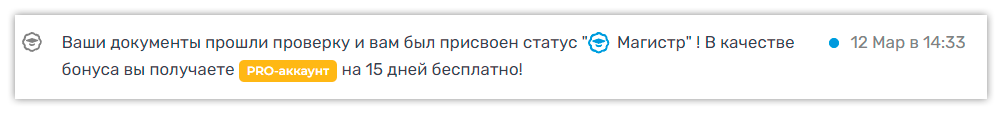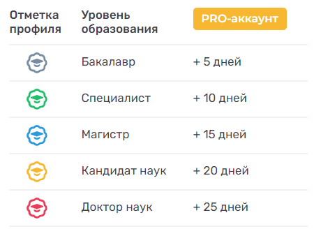 В зависимости от подтвержденного уровня образования, эксперт получит специальную отметку и PRO-аккаунт сразу после подтверждения документов.