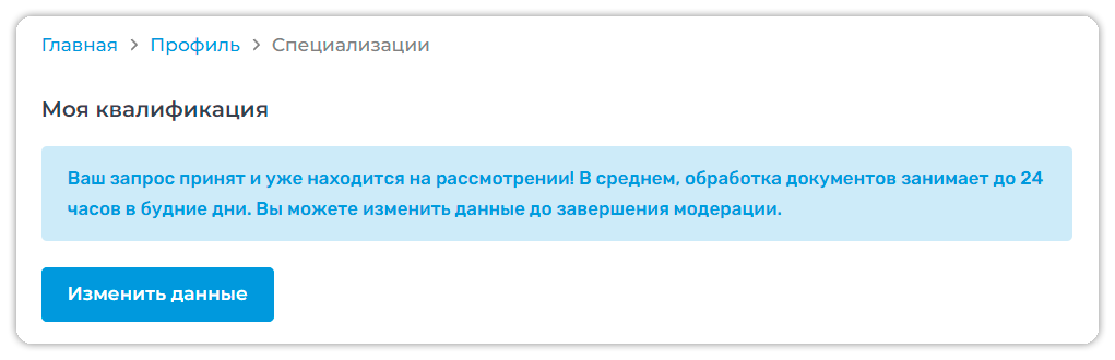 После отправки запроса вы увидите следующее информационное сообщение на странице "Специализации". Запрос можно отредактировать, пока он находится на модерации.