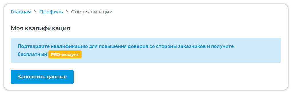 Подтвердить квалификацию и получить соответствующий статус можно на странице "Специализации".