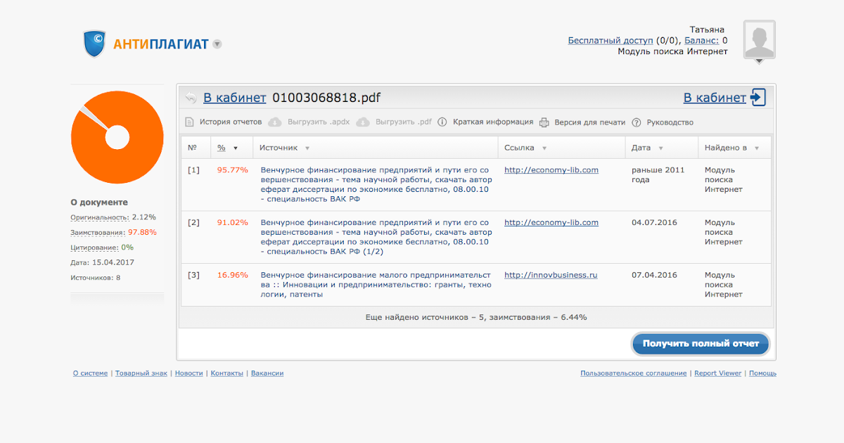 Данный модуль значительно увеличивает точность, так как многие студенты используют интернет-ресурсы при написании своих работ.