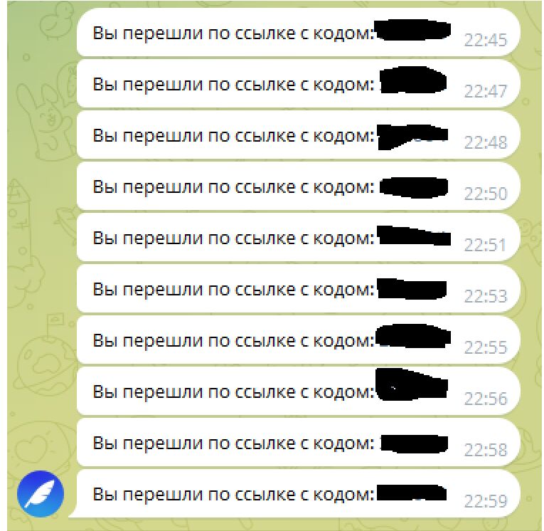 Вот за 5 минут в боте продублировалось сообщение "Вы перешли по ссылке с кодом: "6 цифр"."