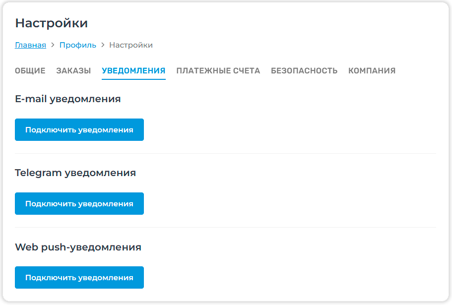 2) Нажмите на кнопку "Подключить уведомления" в блоке Telegram уведомления.
