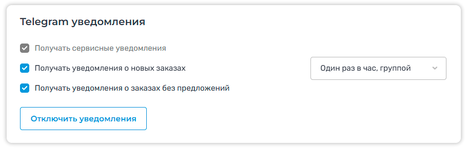 Уведомления в телеграм-боте аналогичны функционалу e-mail-уведомлений. Соответственно, Вы будете получать уведомления по выбранным в Вашем профиле специализациям.