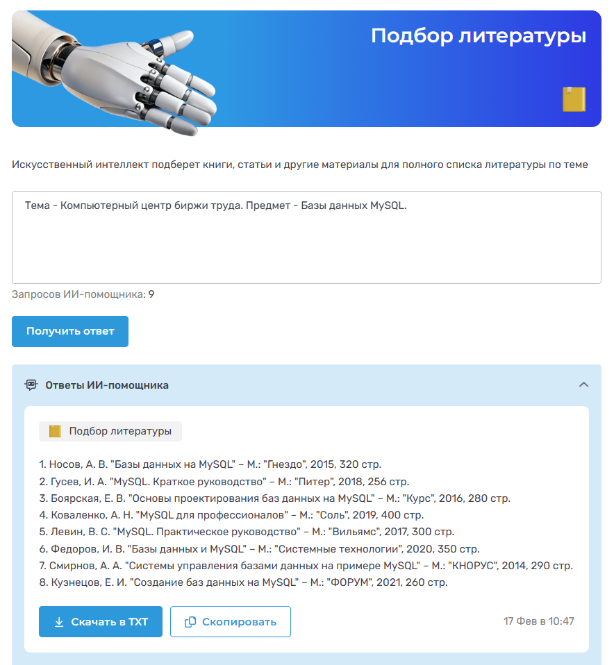 Этот инструмент не заменяет самостоятельную работу, но делает процесс удобнее. Попробуйте бесплатные запросы прямо сейчас! 🚀 Перейти к ИИ-помощнику.