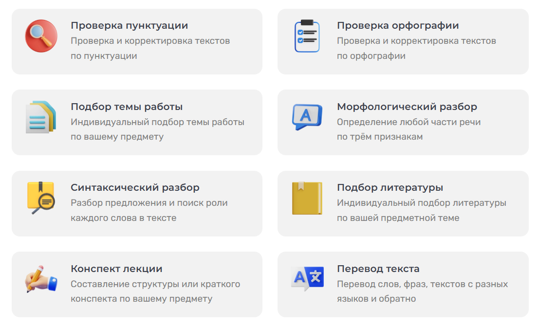На платформе Студворк появился новый инструмент — ИИ-помощник. Это специальный раздел, созданный, чтобы упростить выполнение учебных заданий. В нем доступны 8 функций, которые помогут с различными аспектами учебы: от проверки пунктуации до подбора тем.
