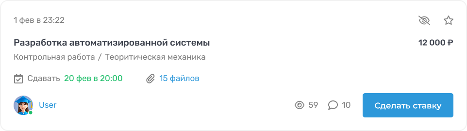 Теперь всё проще. Любая часть карточки ведёт на страницу заказа — достаточно просто кликнуть. Исключения — кнопки «Скрыть», «Добавить в избранное», «Сделать ставку», «Файлы» и никнейм заказчика. Всё остальное — активная зона.