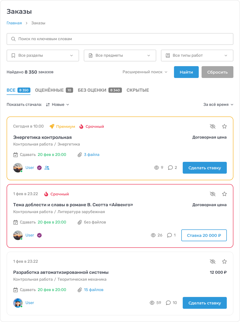В целом неплохо, но внесите корректировку, сейчас к примеру: "Курсовая работа / Другое", а сделайте: "Курсовая работа / Технические дисциплины / Другое", место в карточках позволяет и не составит труда по реализации. А то разделов несколько, а предметов сотни и теперь можно запутаться к какому разделу относится тот заказ, открывать ли его вообще? А это трата времени.