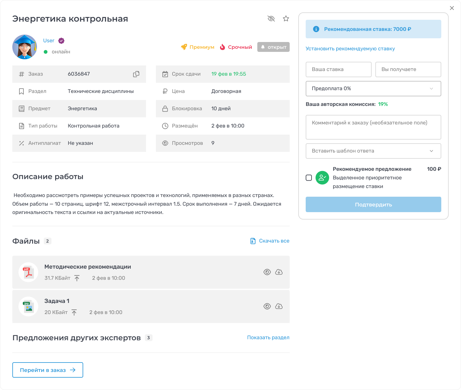 В окне предпросмотра указана вся та же информация, что и на странице заказа. Основная информация, описание, приложенные файлы, ставки других экспертов.