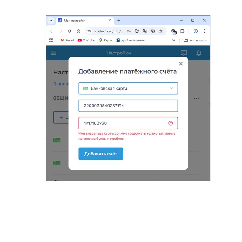 Если в банковской карте в поле "ID" не латинские буквы имени владельца карты, а цифры его индивидуального номера, то такую карту нельзя добавить для вывода средств.