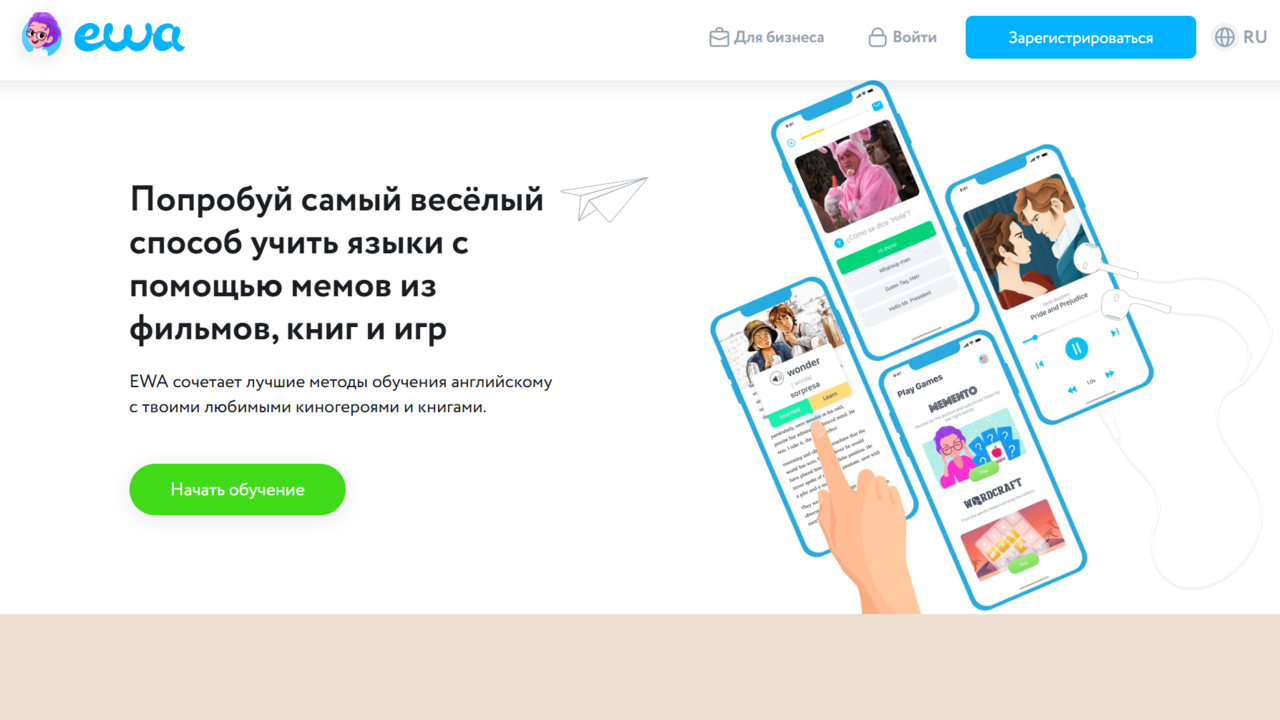 EWA предлагает читать книги и смотреть отрывки фильмов прямо в приложении. Слова можно сразу добавлять в словарь и закреплять упражнениями. Такой формат делает практику ближе к реальной жизни. У EWA более 70 млн пользователей, доход оценивается в $32,4 млн в год.