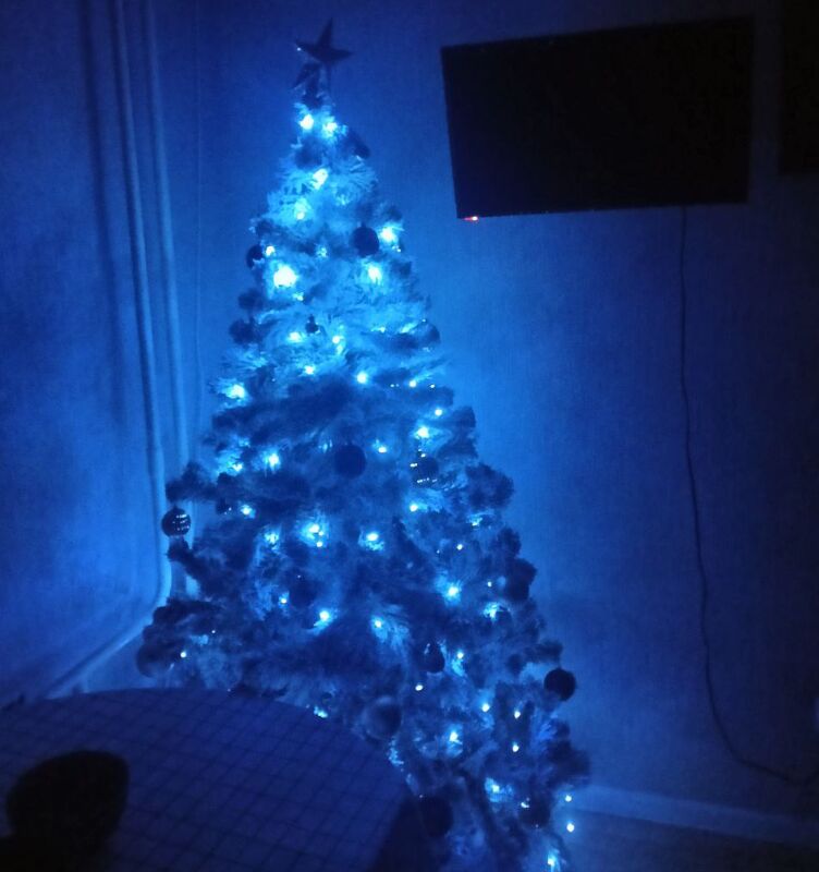 Я не знаю, как елку устанавливать. Он эти гирлянды уже понадкусывал. xD