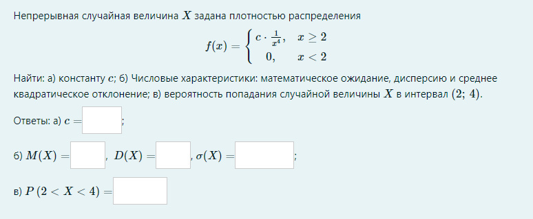 Найти: а) константу c ; б) Числовые характеристики: математическое ожидание, дисперсию и среднее квадратическое отклонение; в) вероятность попадания случайной величины X в интервал (2;4) .